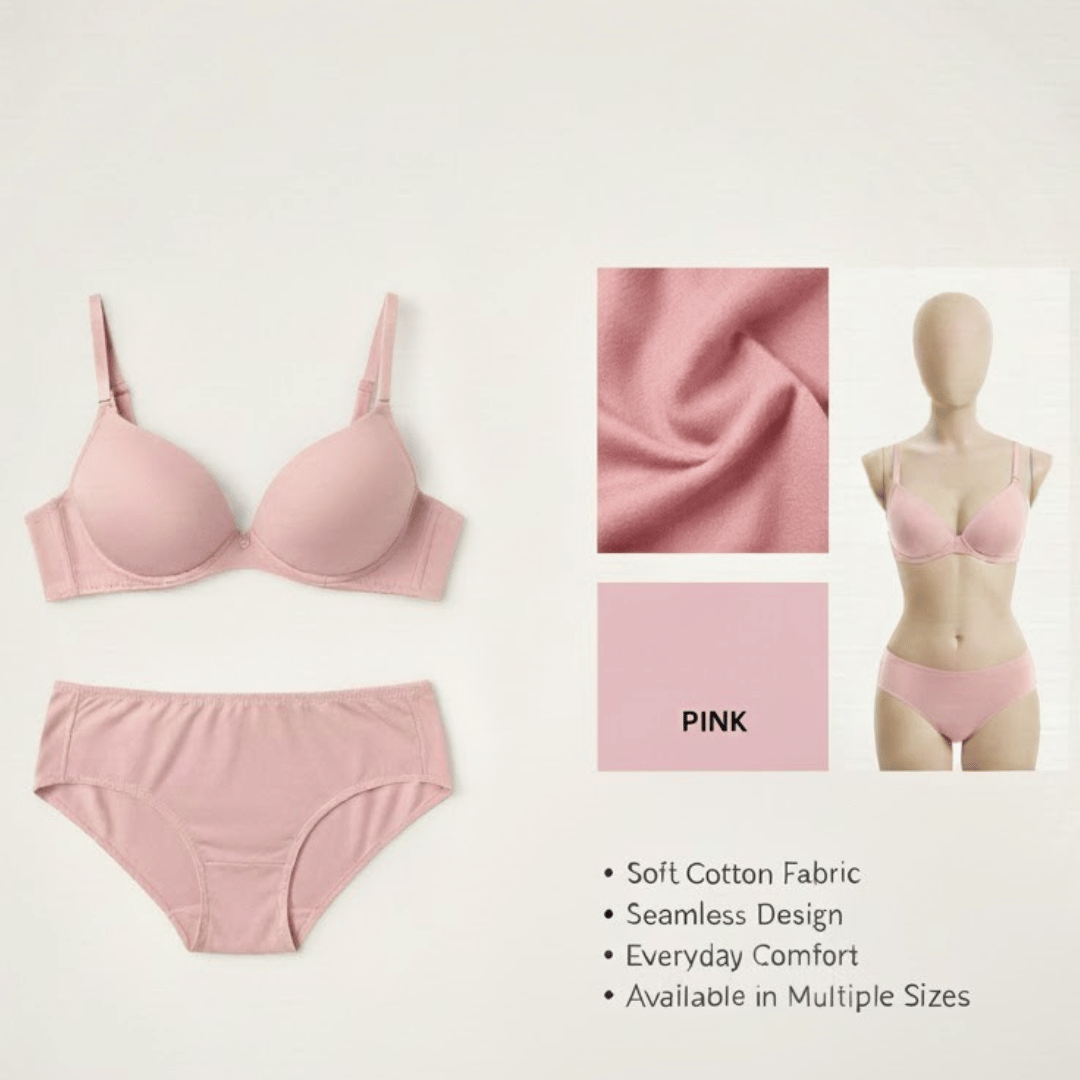 The bra provides natural lift and light support, while the matching panty offers comfort with a smooth, flexible fit. The soft pink color adds a touch of freshness and femininity, perfect for everyday wear, office outfits, and home comfort.