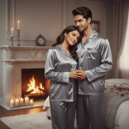 Original price was: Rs7,000.0.Rs4,999.0Current price is: Rs4,999.0.Silk New Couple Pajama Set (Silver) – Luxury & Comfortable Nightwear for Couples